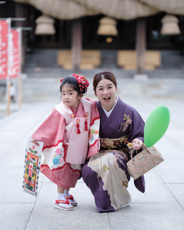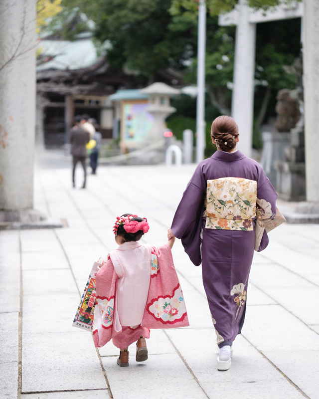 この神社は広い境内と光のきれいな参道が特徴で、七五三ロケーション撮影にとても人気があります。