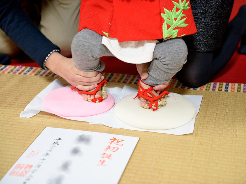 赤ちゃんの足に草鞋(わらじ)を履かせ、紅白のお餅を用意。