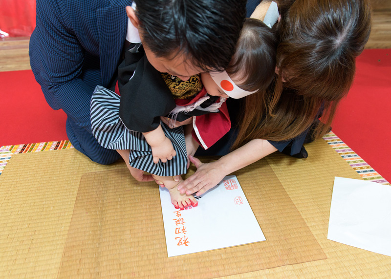 名前と生年月日が入った色紙に足型をとります。